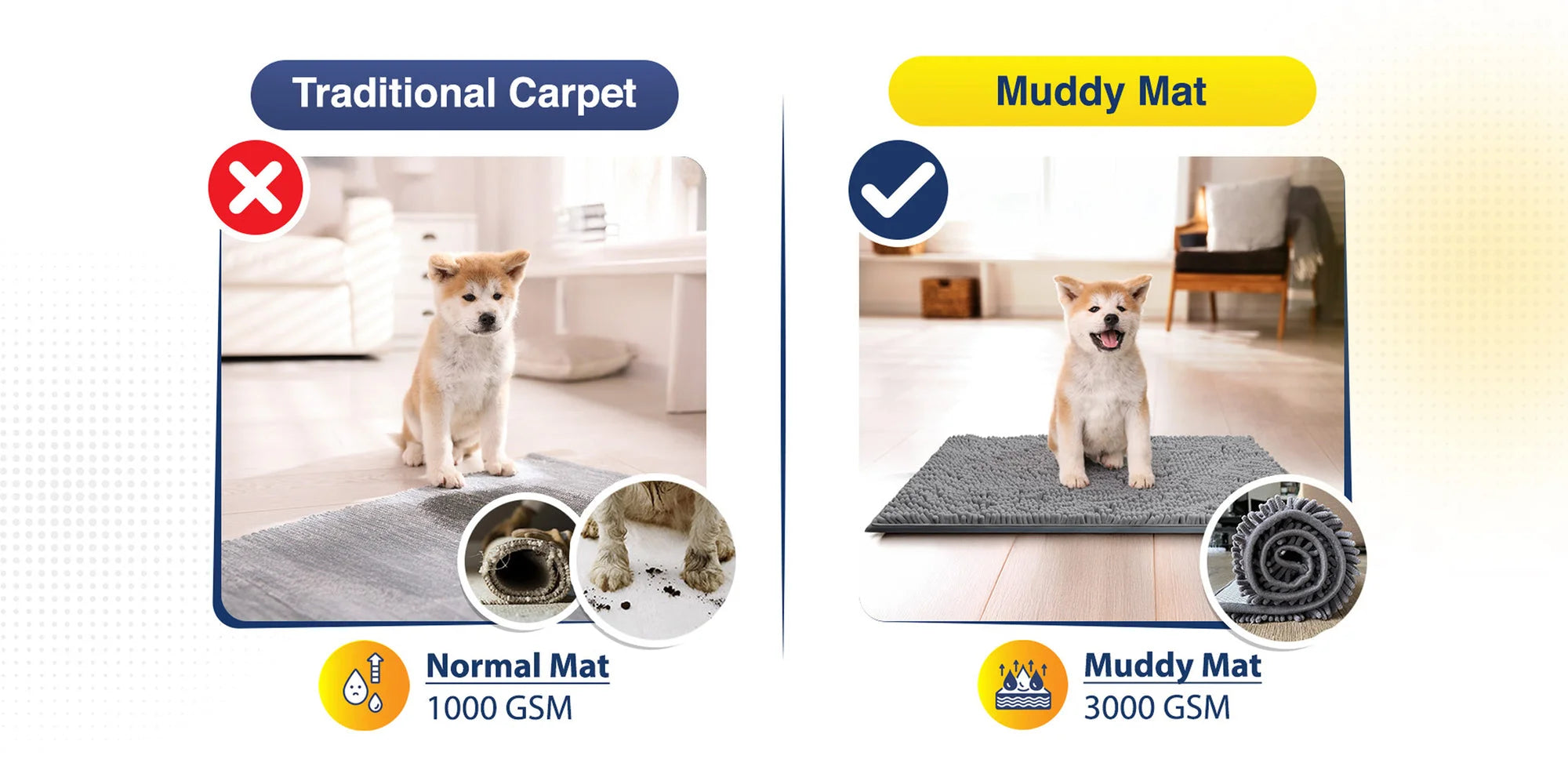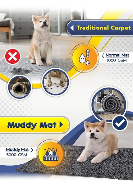 Compared to Normal old doormats, Muddy Mat Soaks Up 5X More Dirt and Water from Paws