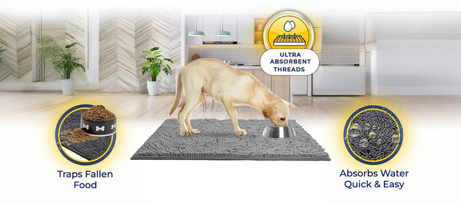 The Muddy Mat will trap any fallen kibble and Absorb All Water For a Quick and Easy Clean-up!