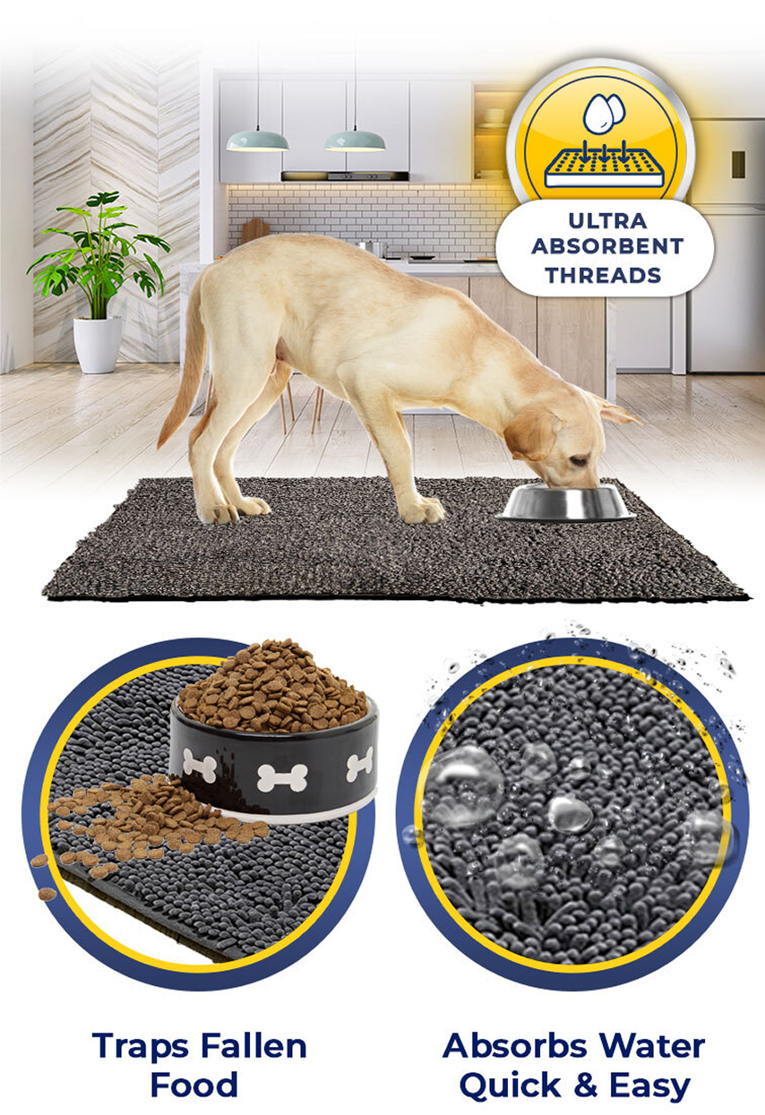 The Muddy Mat will trap any fallen kibble, and absorb All Water For a Quick and Easy Clean Up!